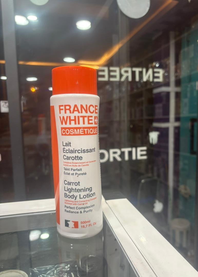 Le France White Lait Carotte est un lait corporel enrichi en extraits naturels de carotte, réputés pour leurs propriétés éclaircissantes, nourrissantes et revitalisantes.