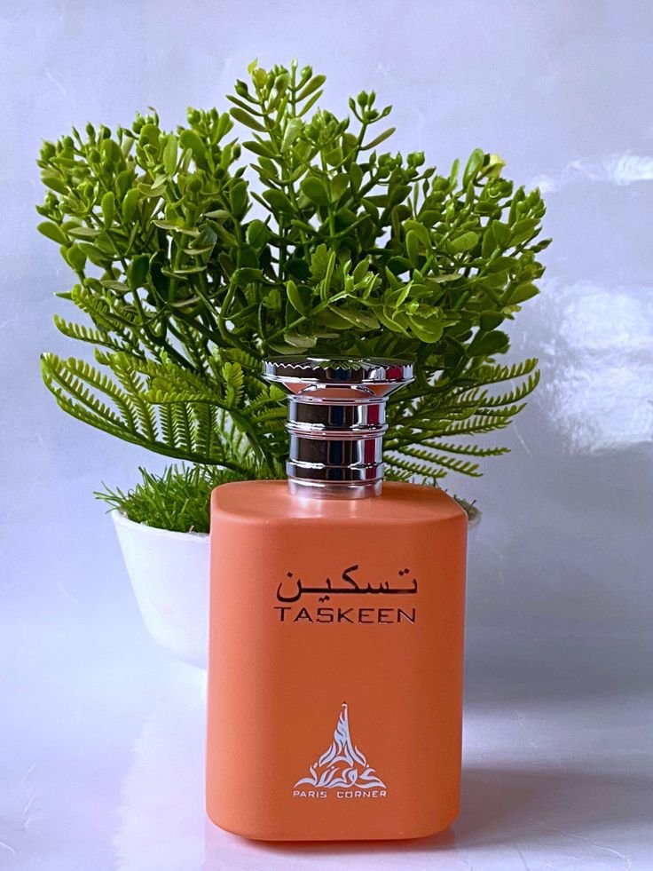 Taskeen de Paris Corner – Eau de Parfum 100 ml : parfum oriental fruité mixte aux notes de pêche, jasmin, vanille et bois précieux. Élégance, caractère et douceur durable.